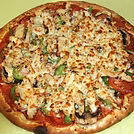 Ingredients: pepperoni, mushrooms, tomatoes, green bell peppers, black olives, and grilled chicken.