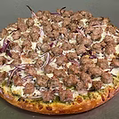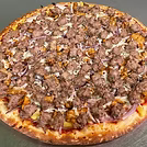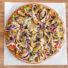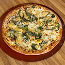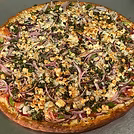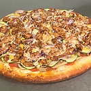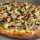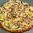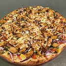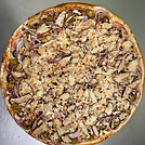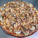 Ingredients: Creamy garlic sauce, pepperoni, BBQ chicken, mushroom, zucchini, pineapple, and red onion.