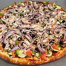 Ingredients: Canadian bacon, pepperoni, Italian sausage, mushrooms, green bell peppers, black olives, and red onions.