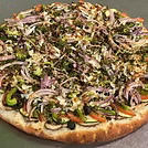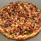 Ingredients: a mixed sauce of creamy garlic sauce and BBQ sauce, bacon, chicken, onions, green chilis, cilantro, broccoli, and jalapenos.