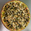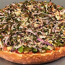 Ingredients: creamy garlic sauce, pepperoni, mushrooms, fresh basil, zucchini, onions, pineapple, and teriyaki chicken.