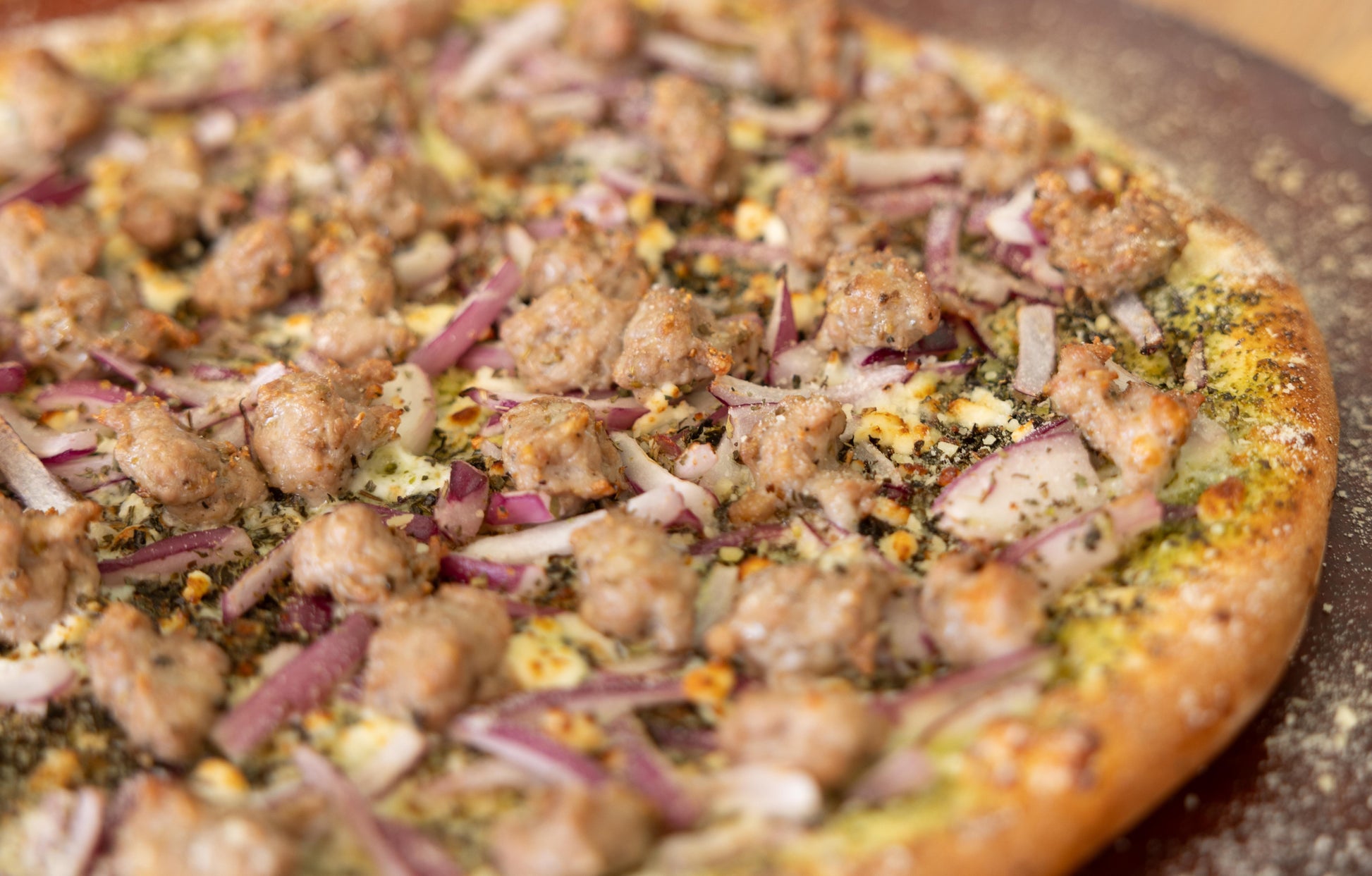 Ingredients: Pesto sauce, Italian sausage, onion, feta cheese, and seasoned with garlic and herbs.