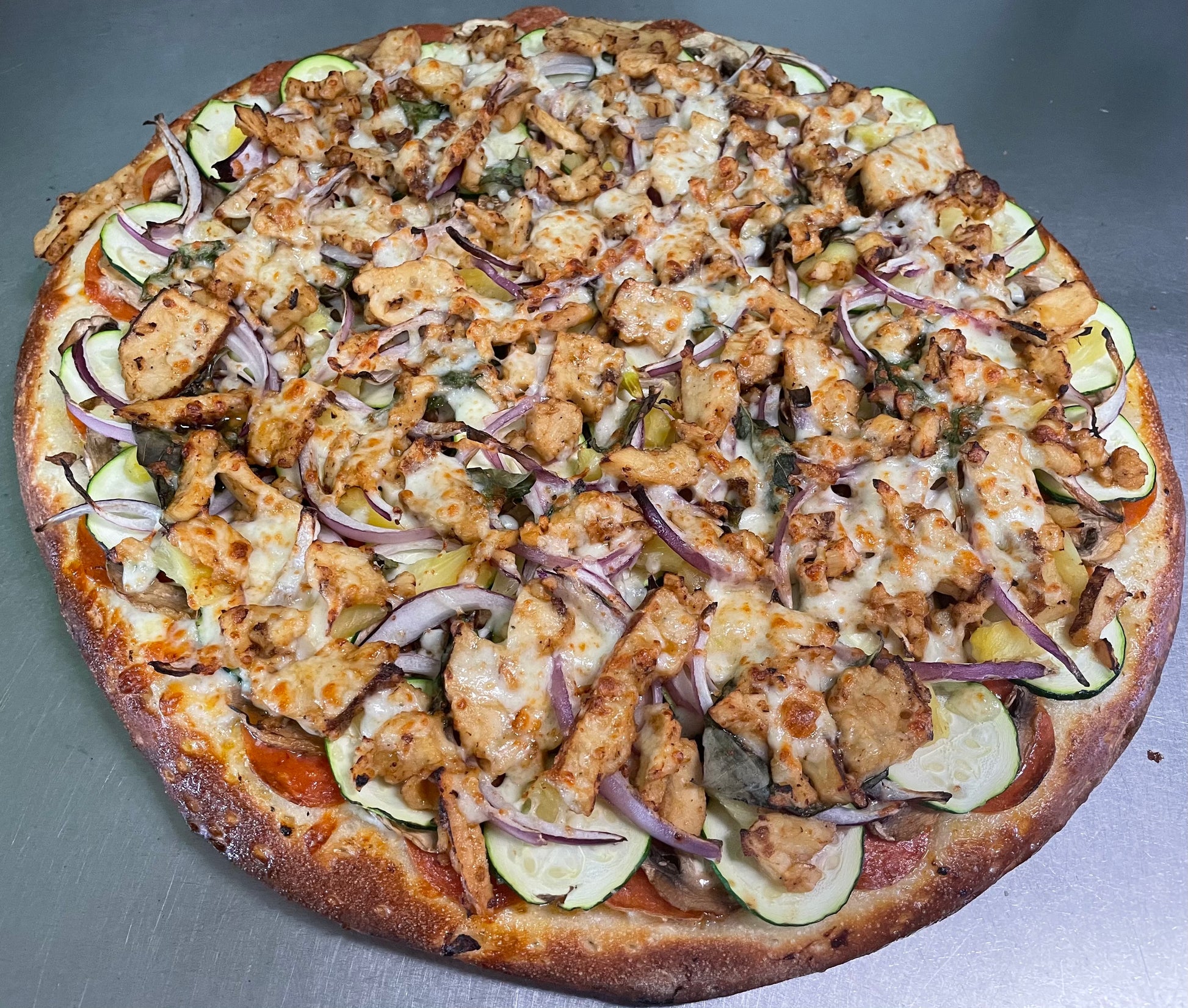 Ingredients: creamy garlic sauce, pepperoni, mushrooms, fresh basil, zucchini, onions, pineapple, and teriyaki chicken.