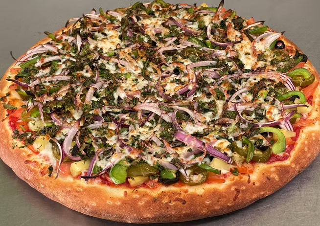 Ingredients: red sauce, tomatoes, bell peppers, jalapenos, pineapple, olives, onions, cilantro, garlic, ginger, and Cajun seasoning.