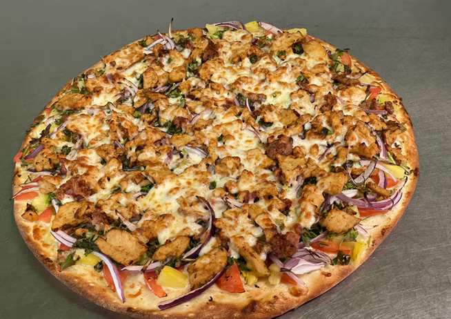 Ingredients: creamy garlic sauce, bacon, BBQ chicken, fresh tomatoes, cilantro, onion, and pineapple.